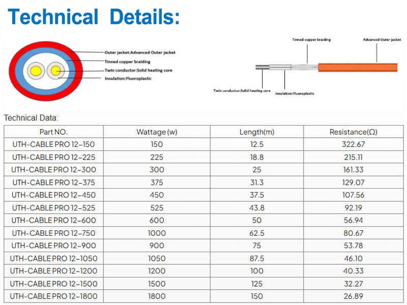 +10%/-5%Sähköinen lattialämmityskaapeli UTH-kaapeli Rro Voidaan käyttää keraamisille laatoille, luonnonkivelle ja puulattioille jne. Se sopii myös joko ensisijaiseen tai toissijaiseen lämmitykseen.